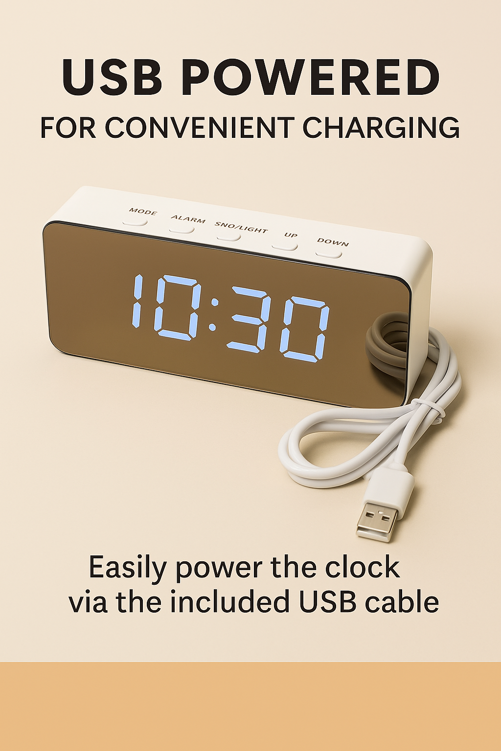 Powered via USB, this clock is compact, lightweight, and travel-friendly — just plug it into any adapter, laptop, or power bank for hassle-free use. Perfect for bedrooms, studies, offices, or gifting, it’s a modern accessory that combines practicality with elegance.